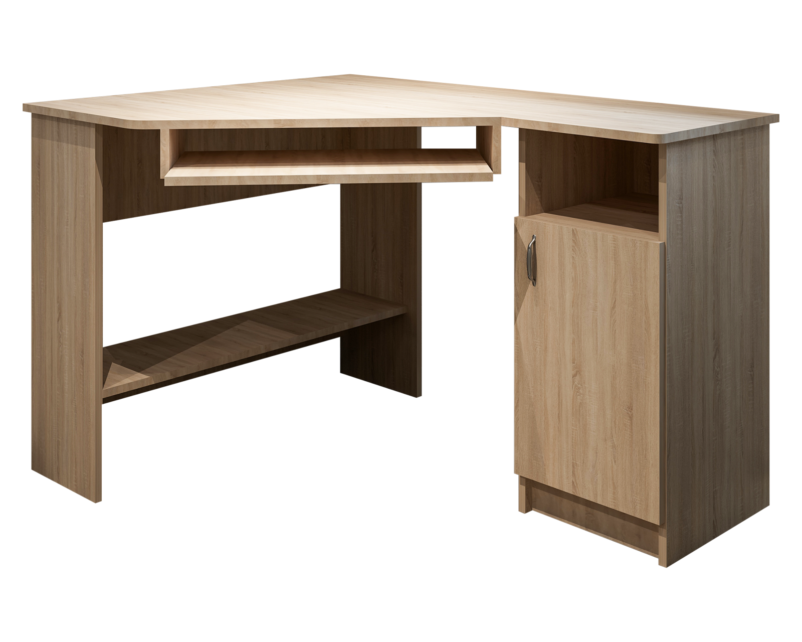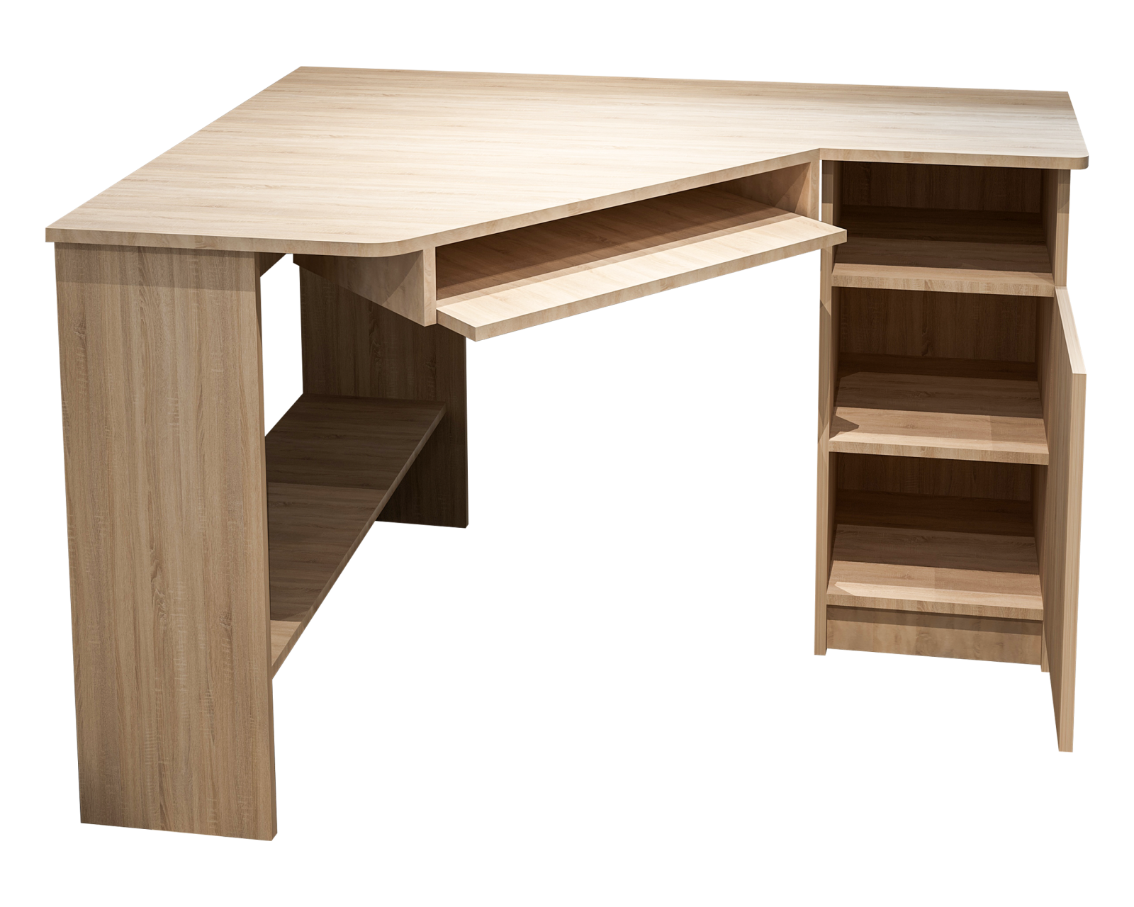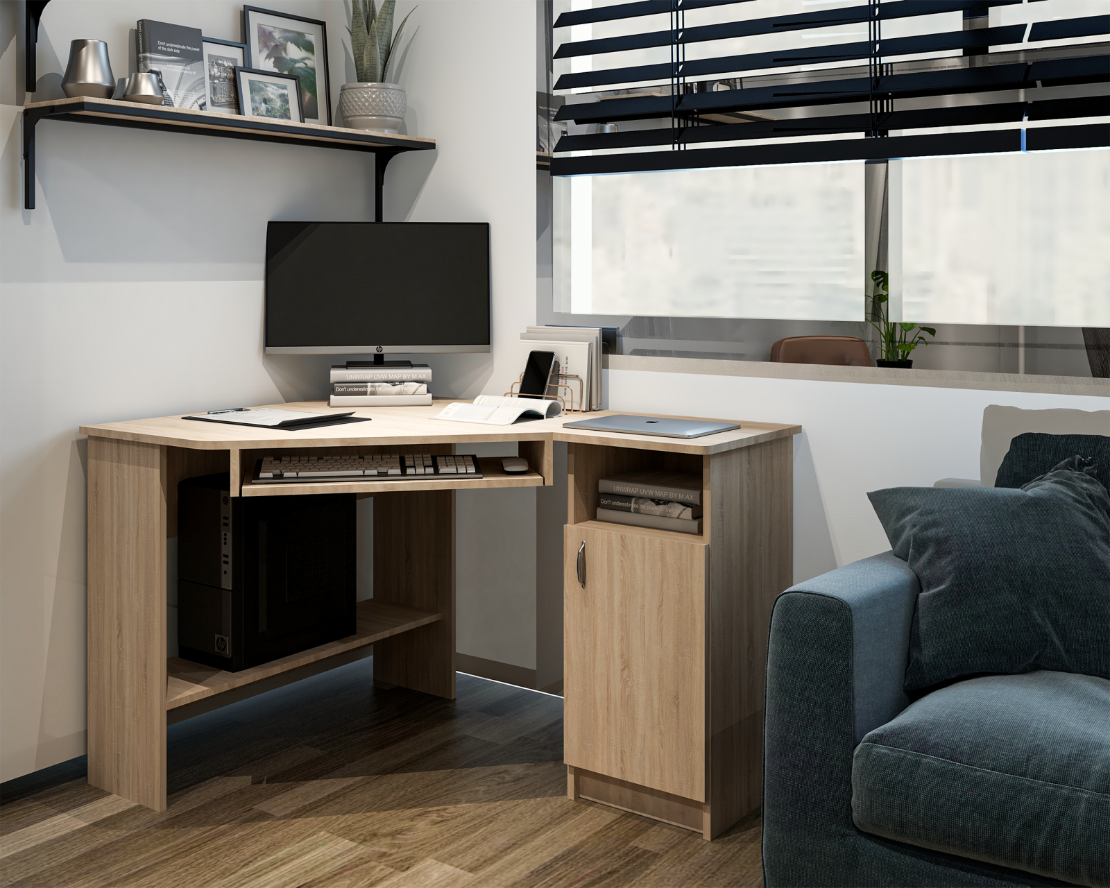 Biroul SU 13 este un birou pe colt, prevazut, pe latura din stanga ( lungime =90cm ) cu suport glisant pentru tastatura si un raft depozitare in partea inferioara.
