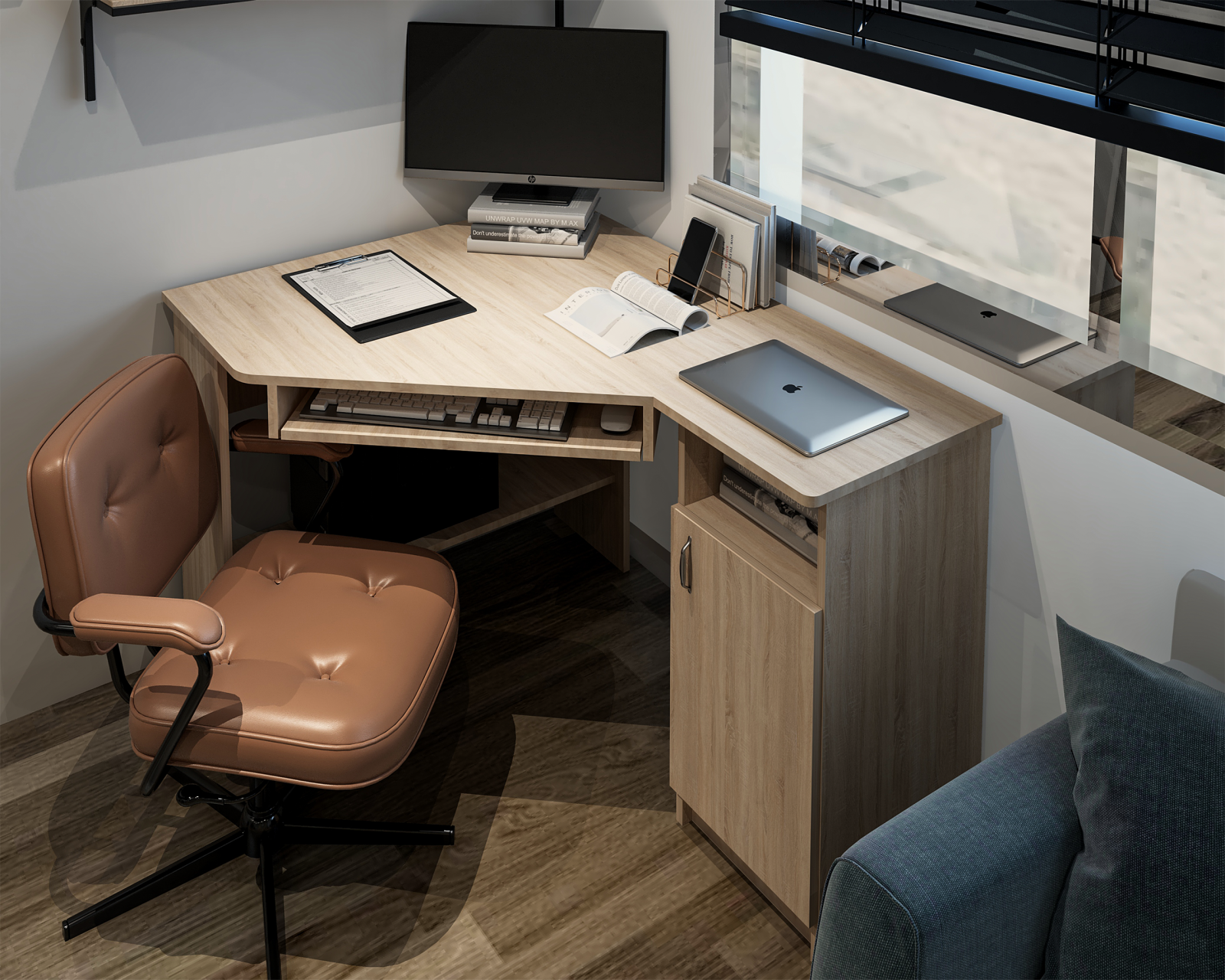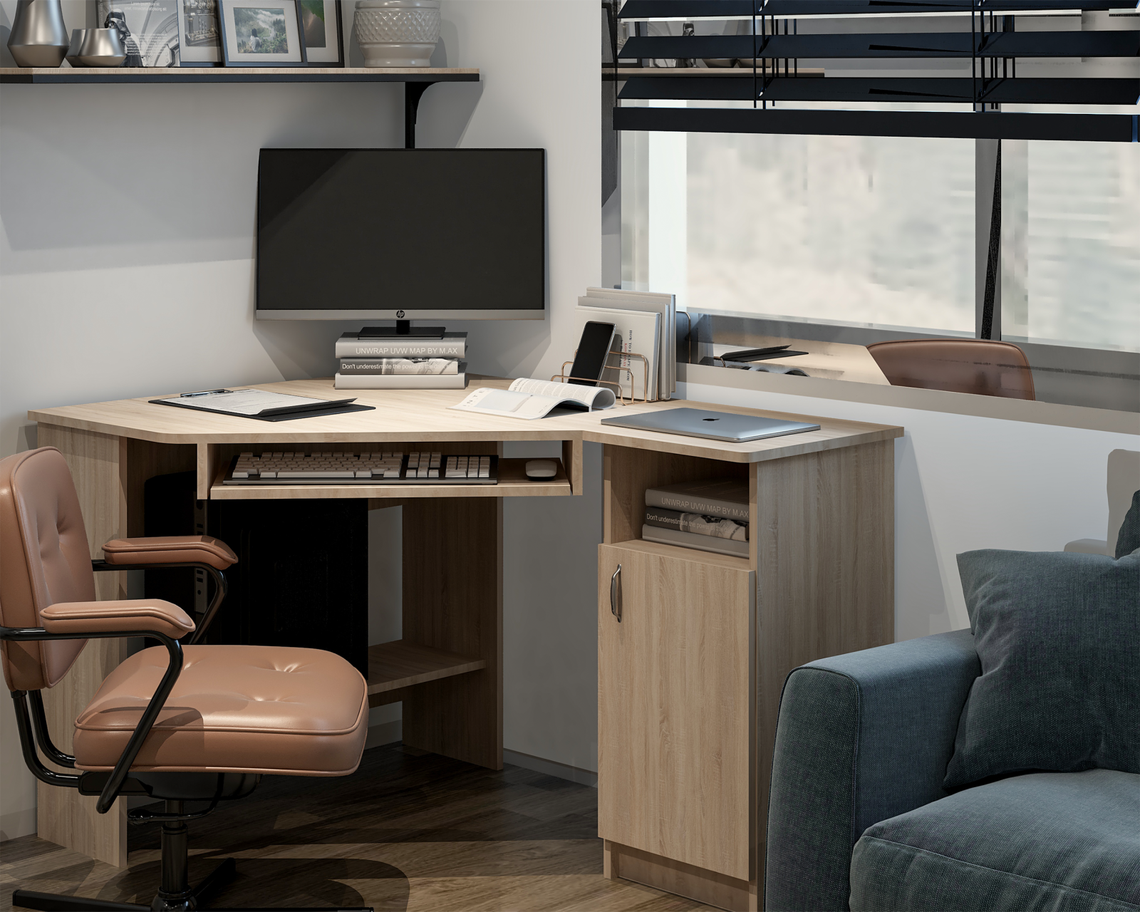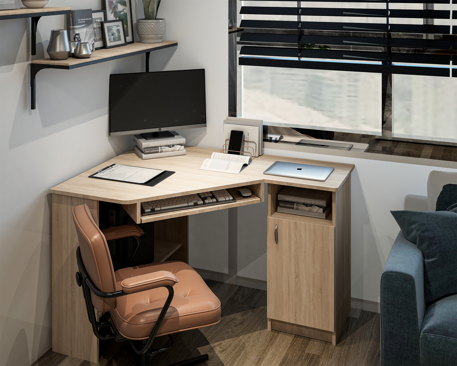 Biroul SU 13 este un birou pe colt, prevazut, pe latura din stanga ( lungime =90cm ) cu suport glisant pentru tastatura si un raft depozitare in partea inferioara.