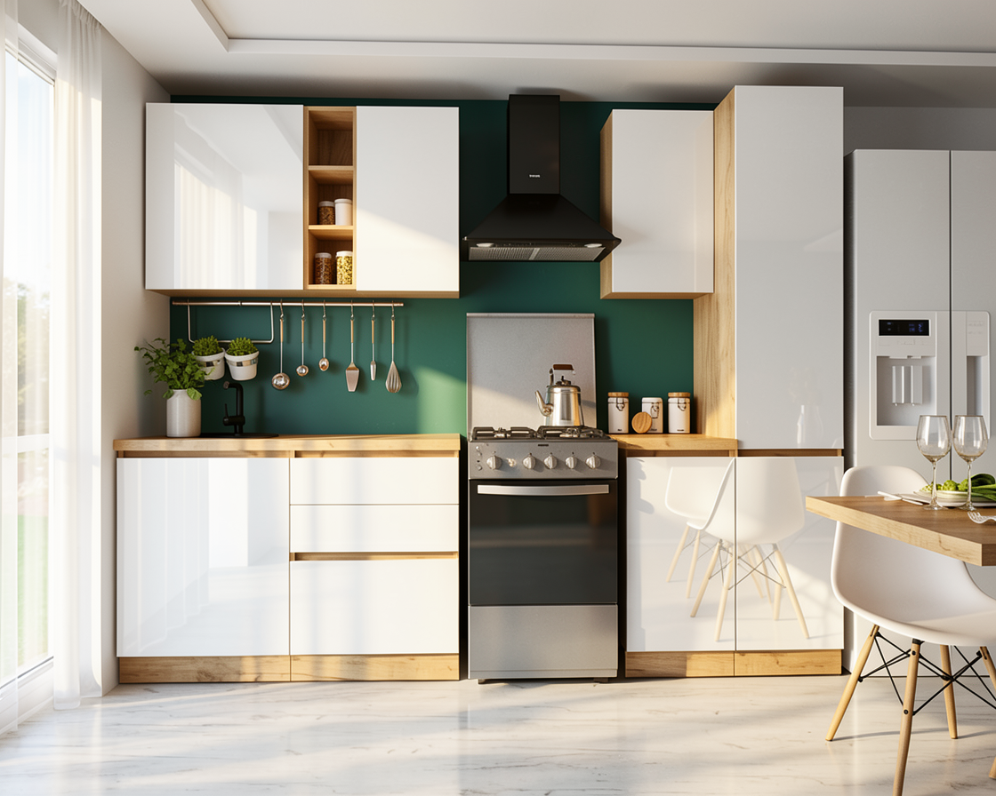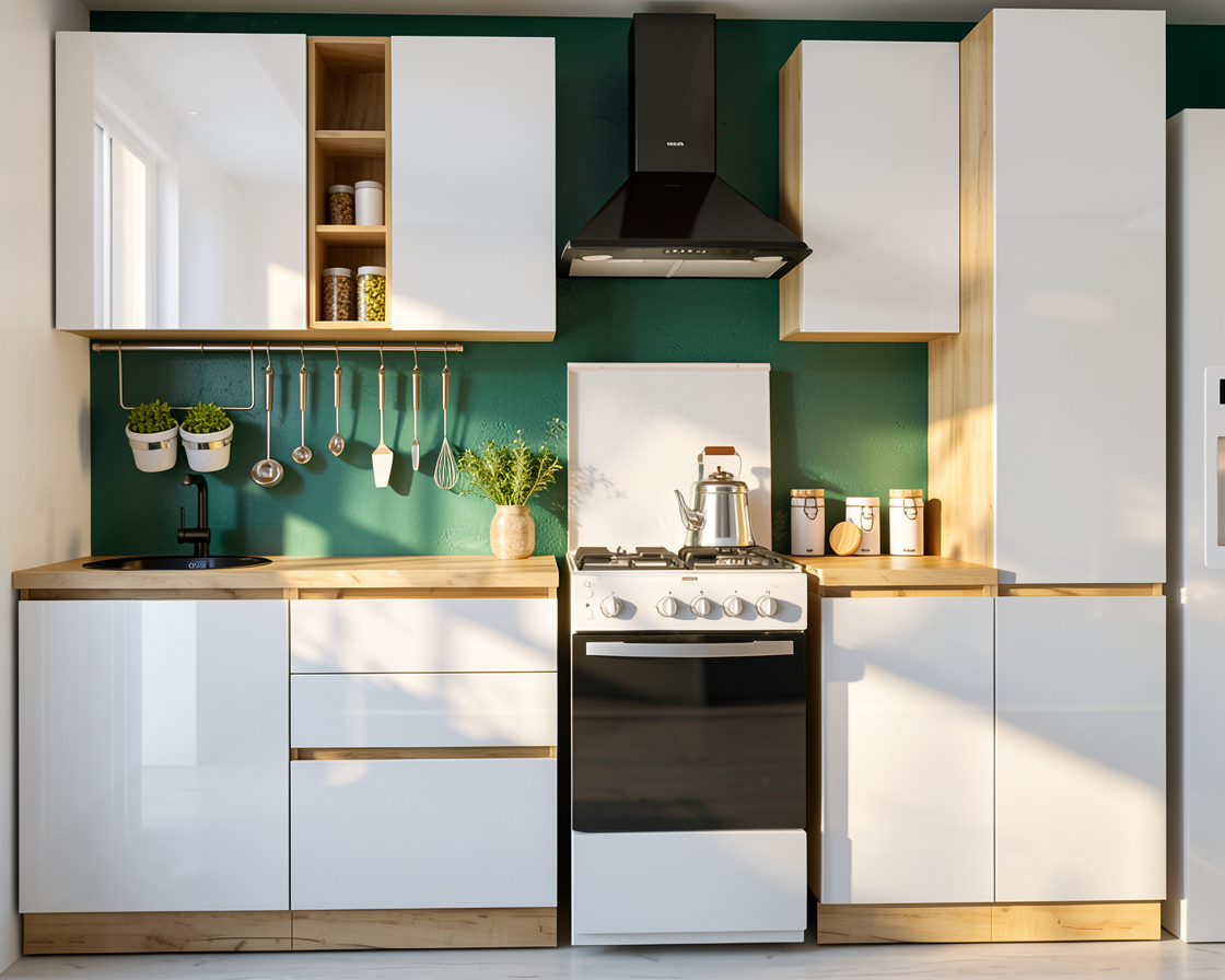 Set de mobilier pentru bucătărie cu design contemporan, realizat din PAL melaminat Stejar K003 și fronturi MDF AGT alb lucios. Configurația include corp tip soldat, sertare metalice și blat termorezistent, fiind potrivită pentru bucătării moderne.