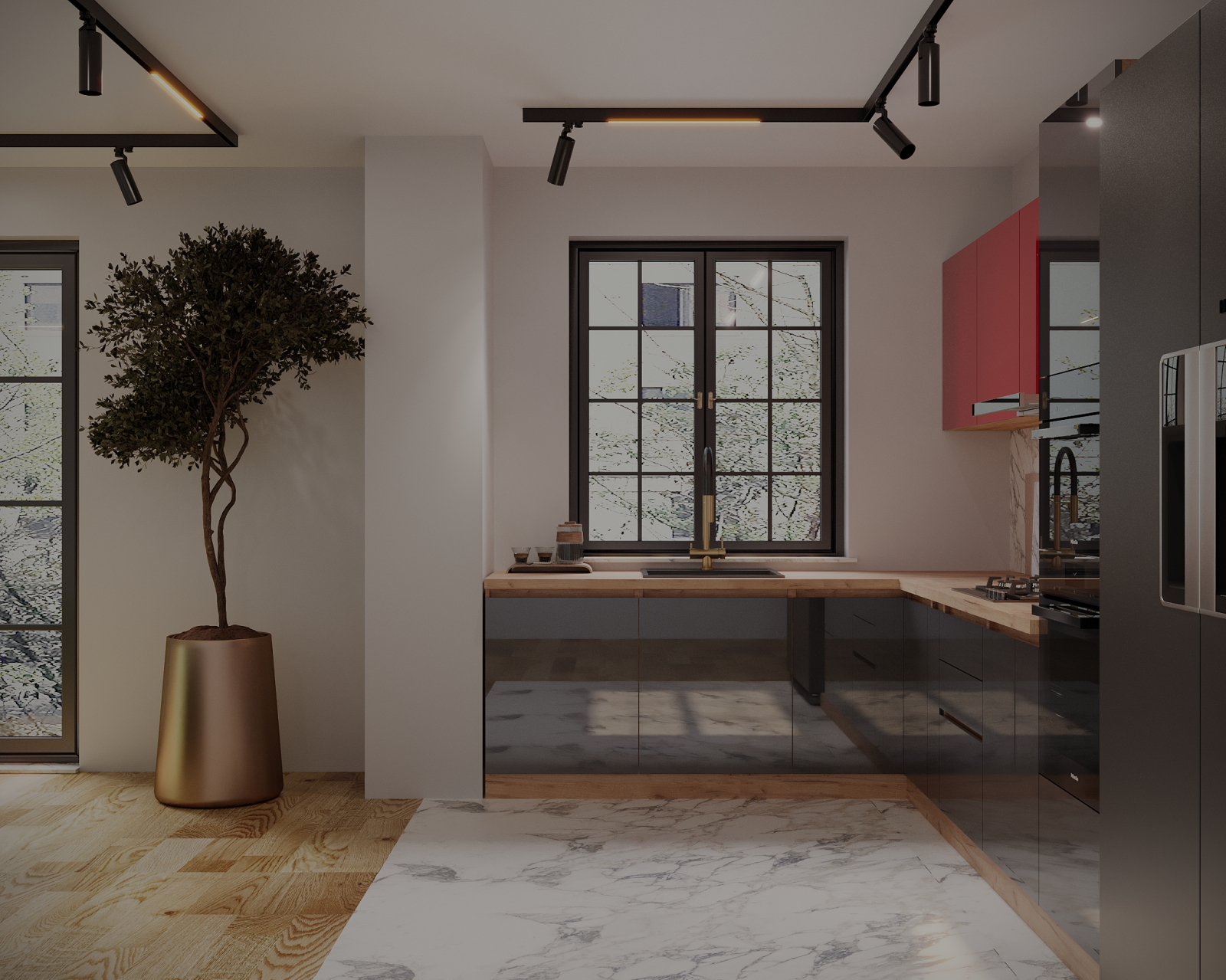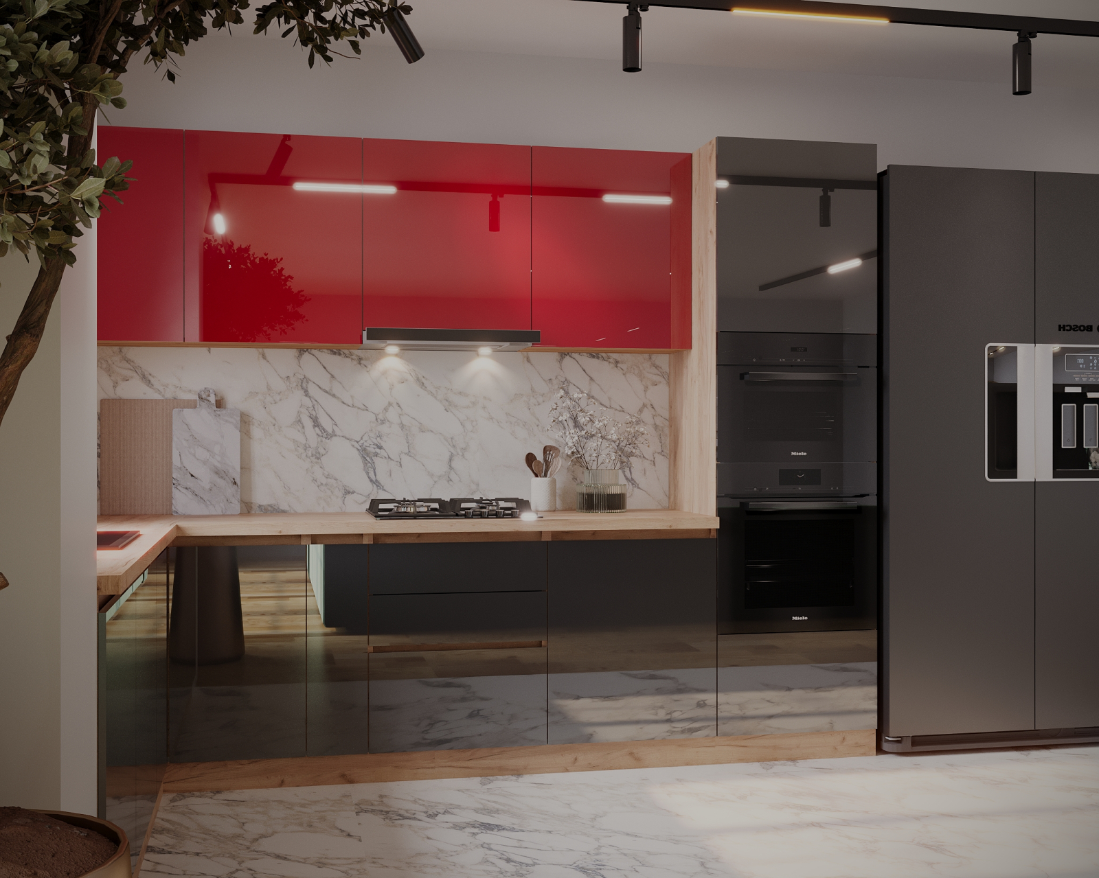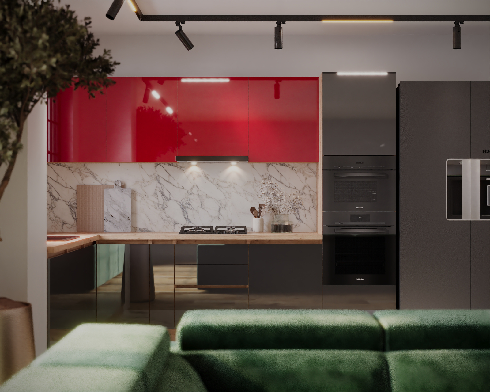 Bucatarie colt Chelsea V2, 221/300x60x200 cm, Rosu, Antracit /Stejar K003