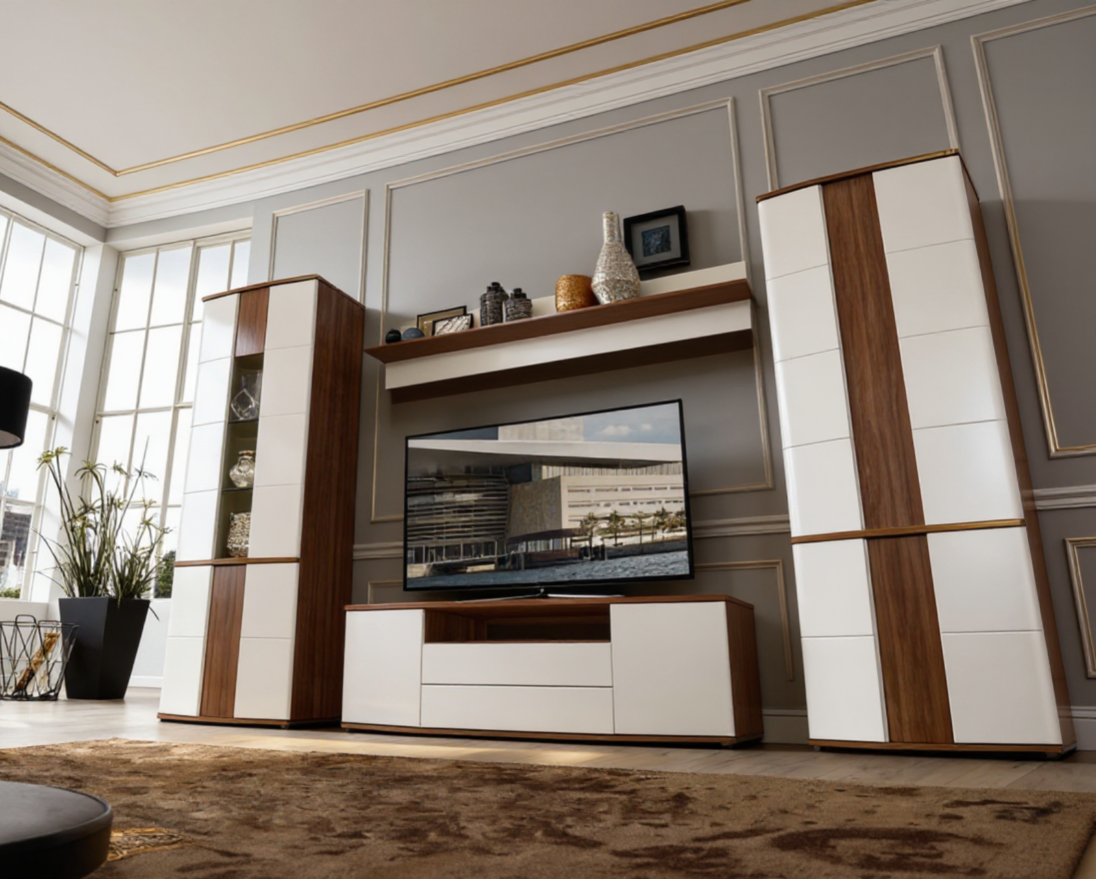 Set de mobilier pentru living, cu design modern și contrast elegant Alb Frasin Shimo, conceput pentru organizare eficientă, spații de depozitare generoase și o zonă TV bine definită.