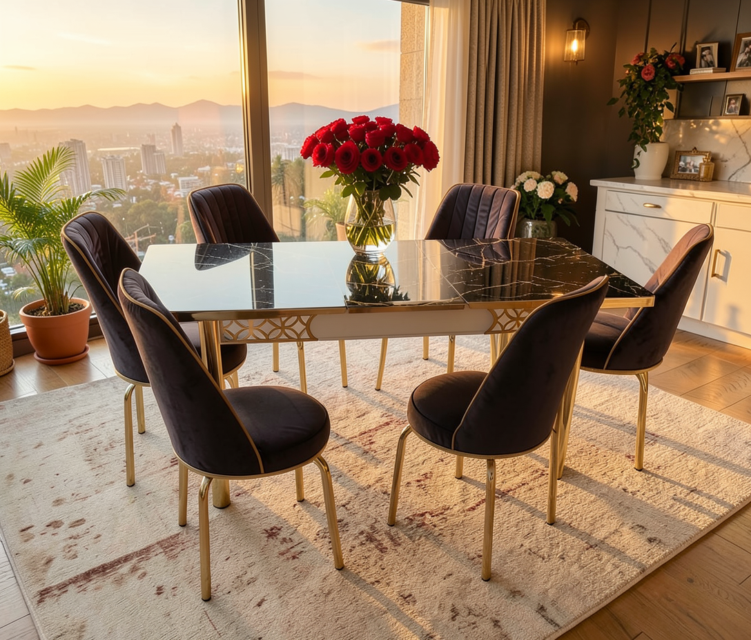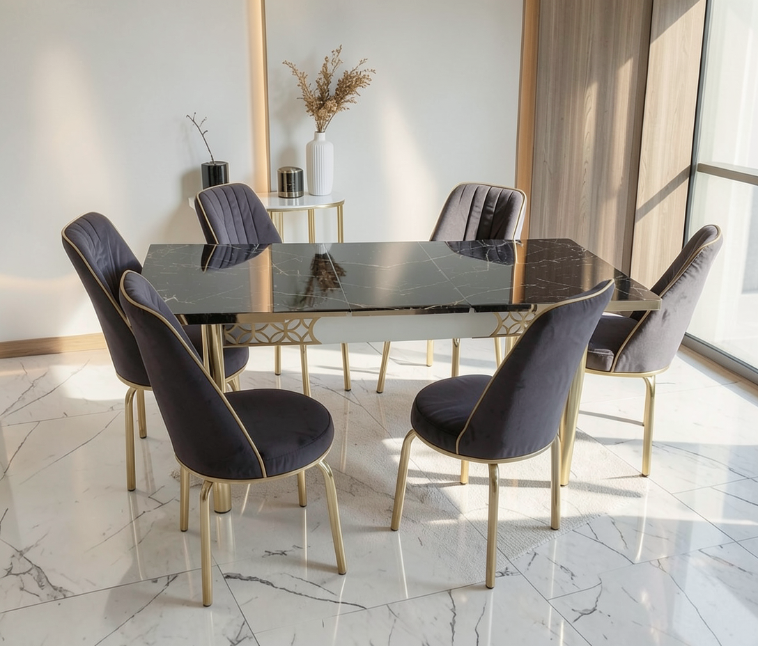 Set masă cu 6 scaune, cu design modern, realizat din materiale rezistente, ideal pentru bucătărie sau dining. Masa extensibilă oferă spațiu suplimentar și stabilitate.
