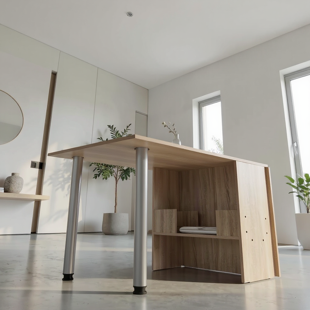 Masa permite reglarea dimensiunii prin ridicarea uneia sau a ambelor părți laterale. Cele două extensii sunt susținute de picioare metalice, asigurând stabilitate sporită atât în poziția pliată, cât și în cea extinsă.