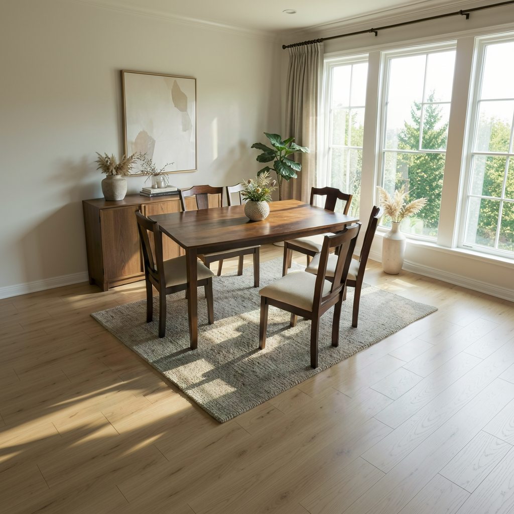 Set masă cu 6 scaune tapițate, cu design modern și finisaj Dirty Oak, potrivit pentru living sau bucătărie. Masa dreptunghiulară este rezistentă și ușor de întreținut, iar scaunele asigură confort prin șezutul buretat și tapițeria din stofă. Poze reale!!!