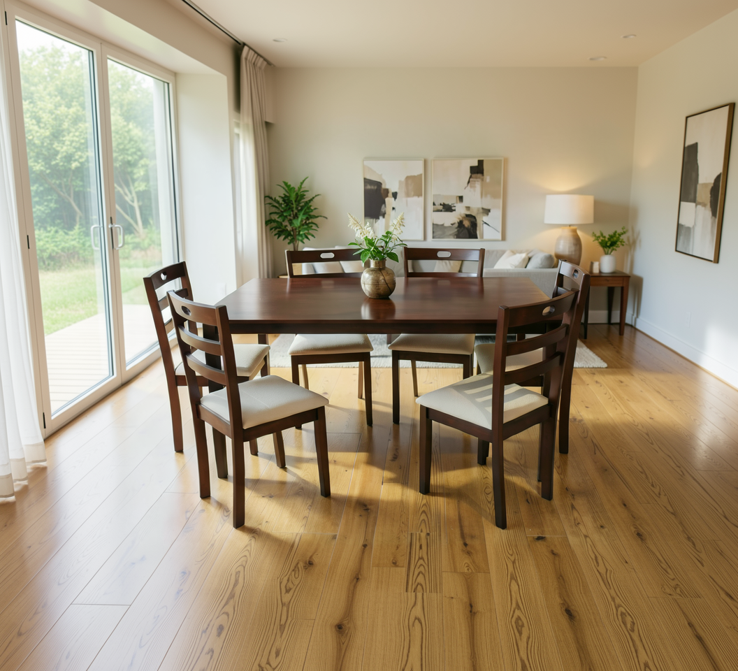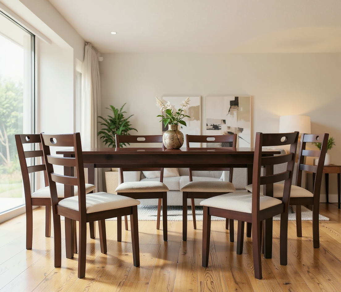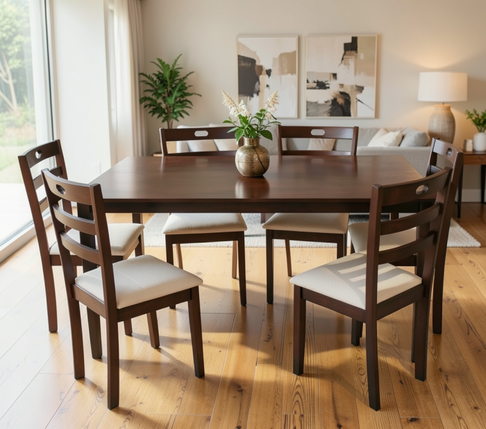 Set de mobilier format din masă și 6 scaune tapițate, realizat din lemn și MDF furniruit, cu design clasic și structură solidă. Potrivit pentru bucătărie sau living, conceput pentru utilizare îndelungată.