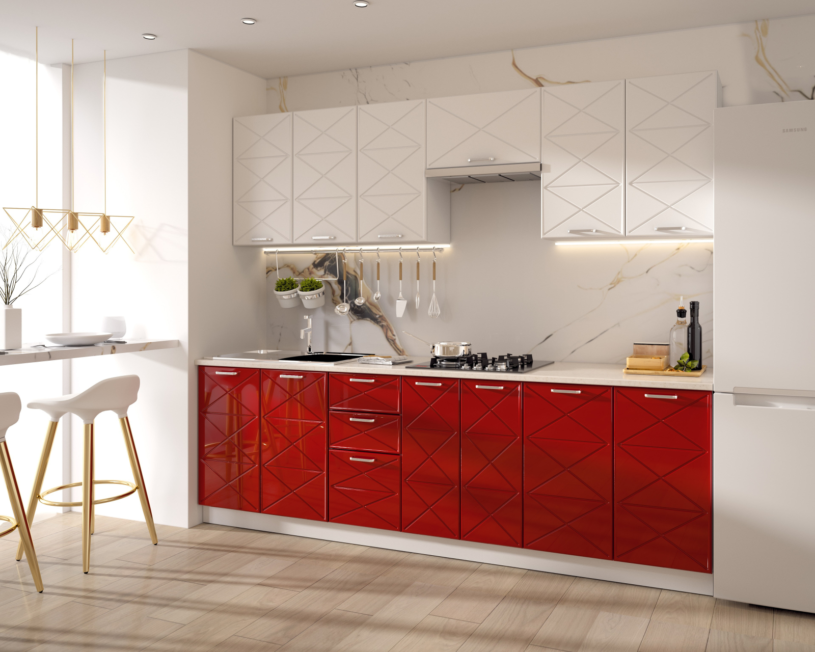 Set mobilier bucătărie modern, realizat din PAL melaminat și MDF infoliat, în combinație Alb + Roșu, cu design contemporan și spațiu generos de depozitare.