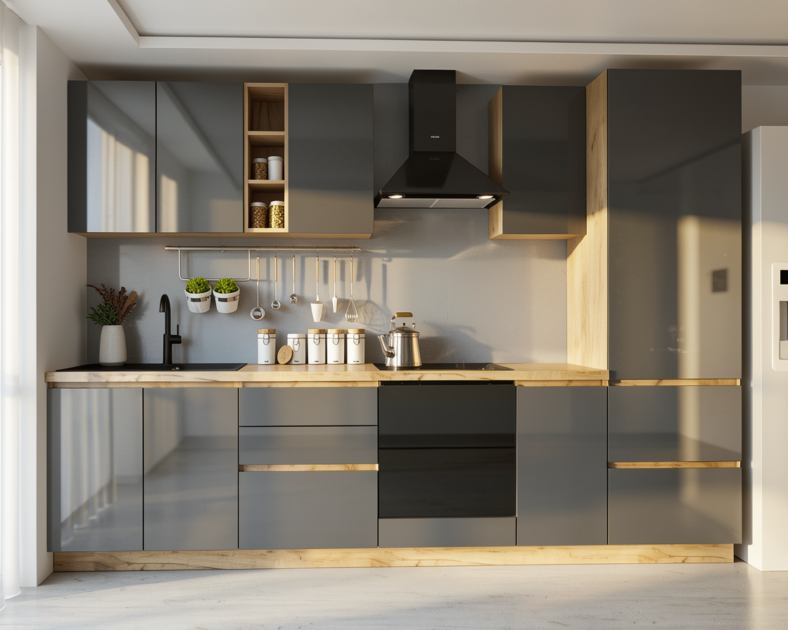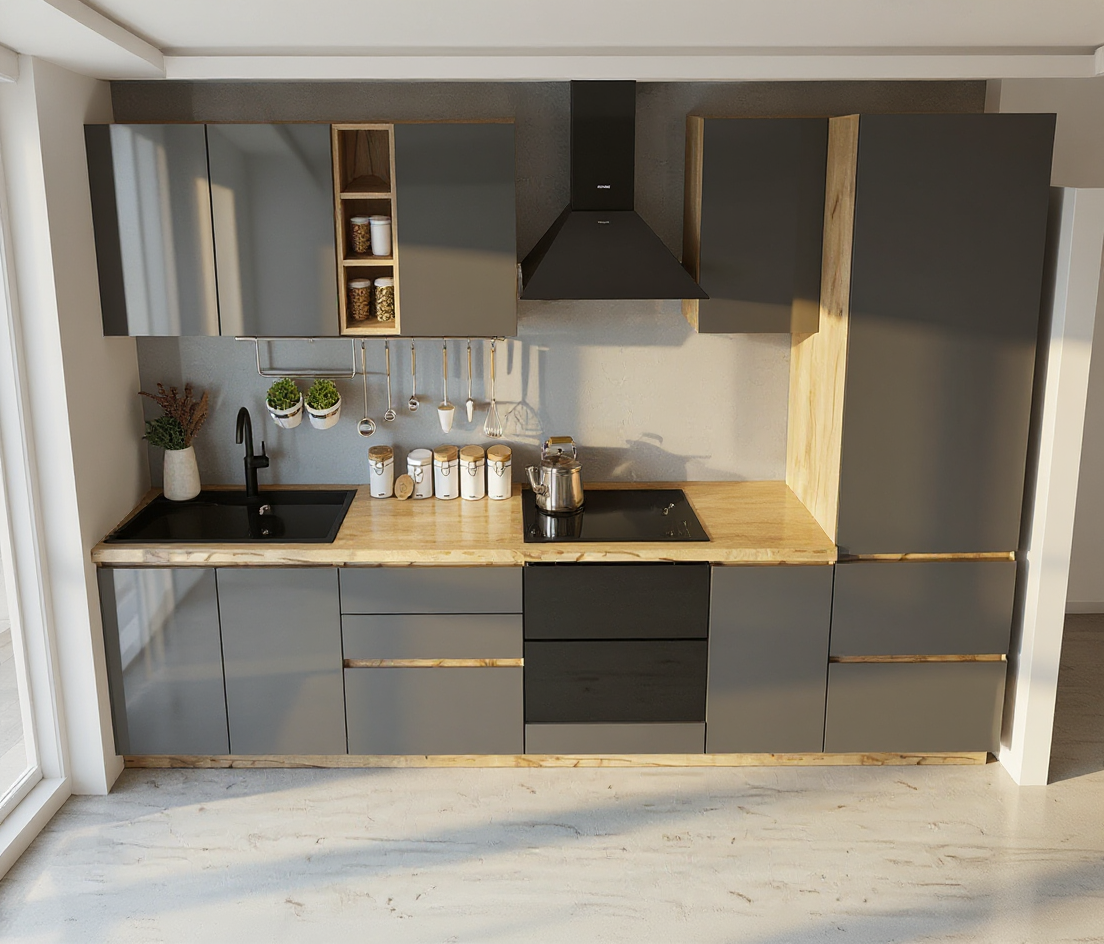 Set de mobilier pentru bucătărie, realizat din PAL melaminat Stejar K003 și fronturi MDF AGT antracit lucios, cu design contemporan și configurație premium. Bucătăria oferă spațiu generos de depozitare, funcționalitate ridicată și finisaje moderne, potrivite pentru bucătării mari.