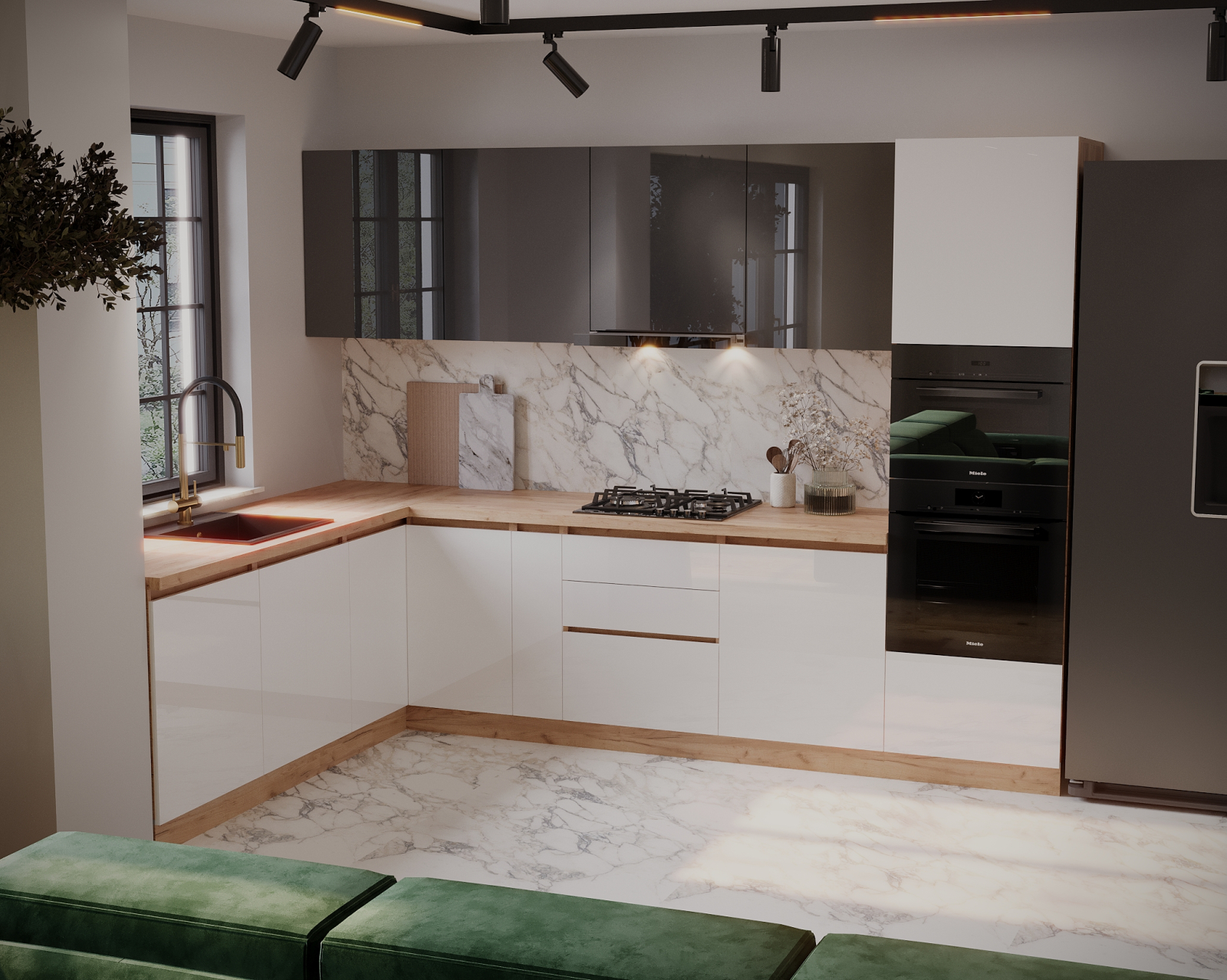Bucatarie colt Chelsea V2 ,221/300x60x200 cm, Gri antracit , Alb /Stejar K003