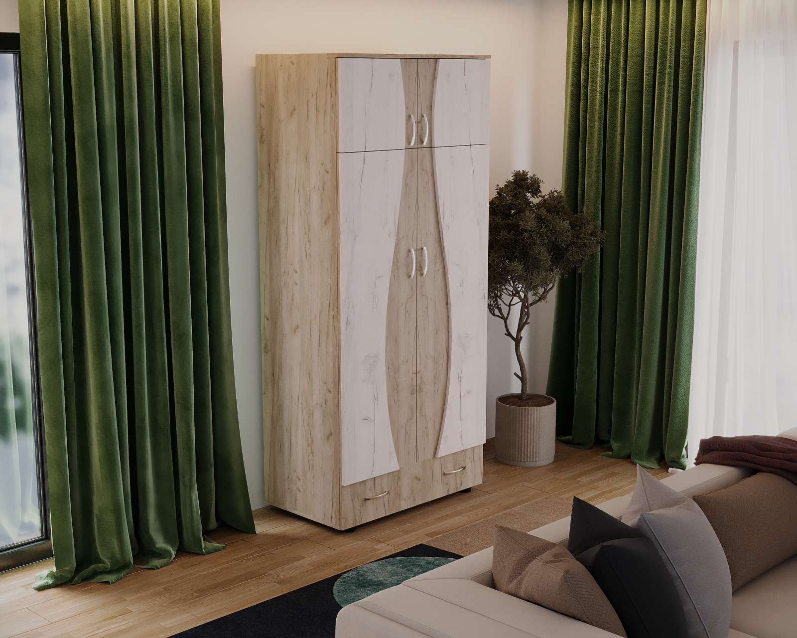 Dulap cu design contemporan, realizat din PAL melaminat în nuanțe K002+K001, cu compartimentare practică. Este format din două corpuri (dulap și suprapozabil), oferind spațiu eficient pentru depozitare haine și accesorii.