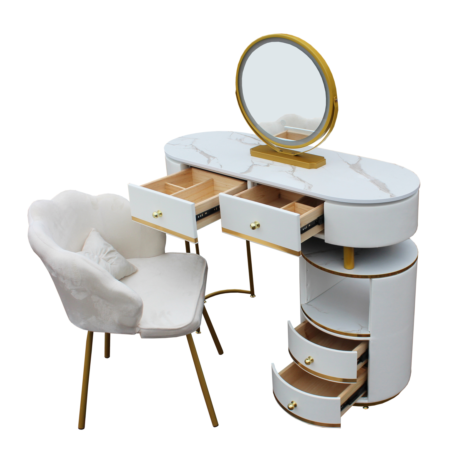 Această masă de toaletă are 2 sertare și un dulap de depozitare, oferind suficient spațiu pentru a vă ajuta să vă puneți toate produsele de îngrijire a pielii; cosmeticele, bijuterii, uscător de păr, ondulator și alte articole de înfrumusețare. Unul dintre sertarele mari are compartimente suplimentare care pot fi împărțite pentru depozitarea bijuteriilor.