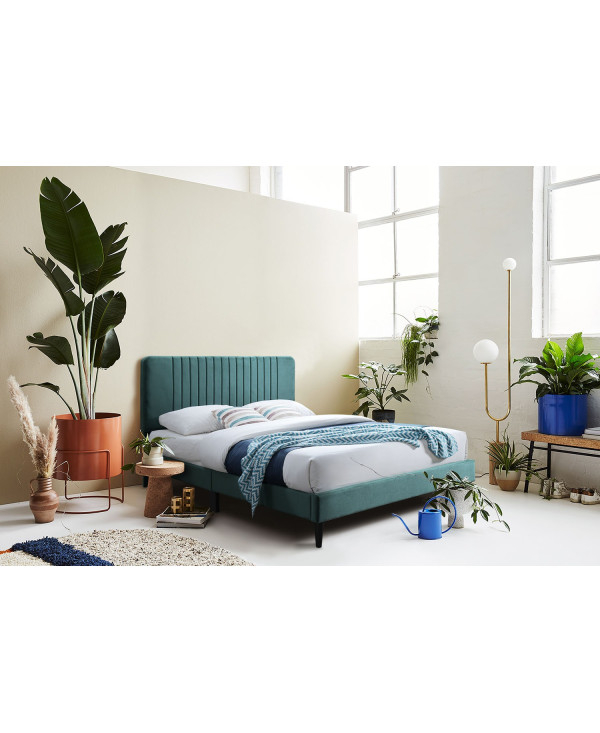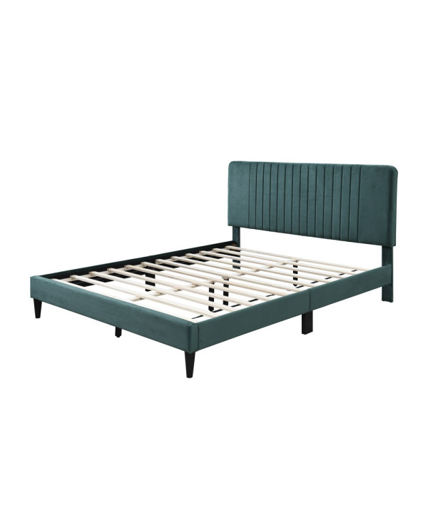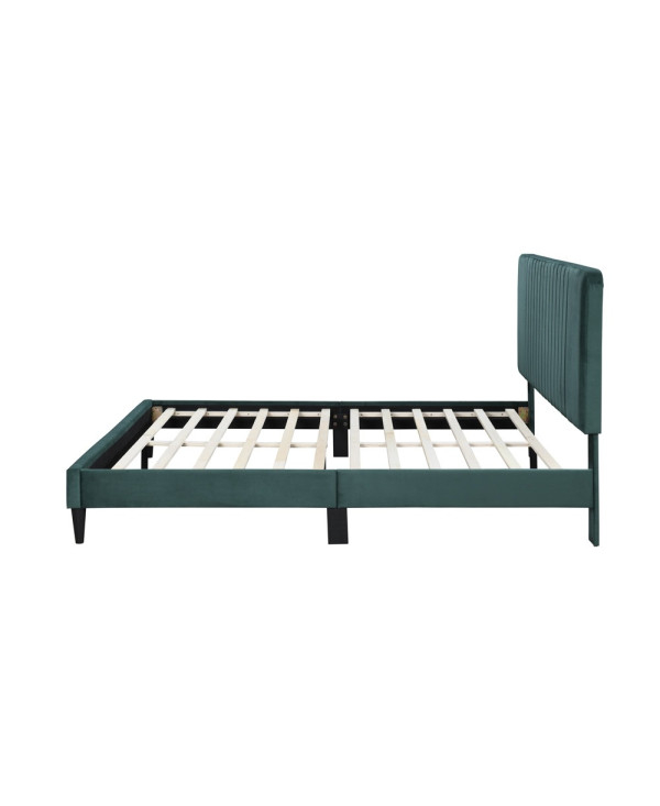 Pat tapitat Emerald cu catifea verde, 140x200, cadru din lemn cu somiera fixa
