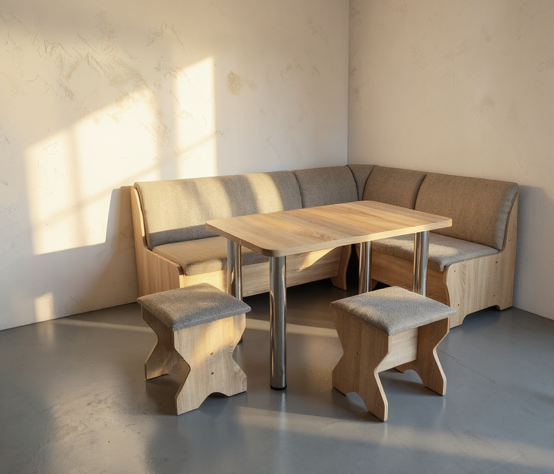 Set mobilier pentru bucătărie, cu design contemporan și structură practică, compus din colțar cu spații de depozitare, masă fixă și taburet.